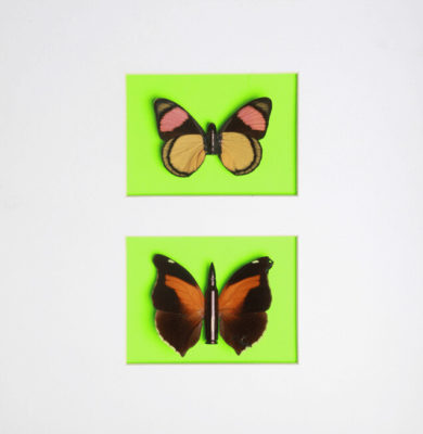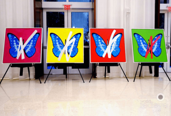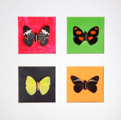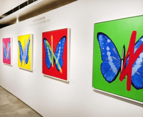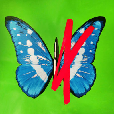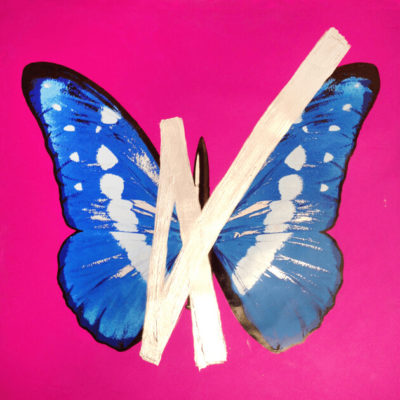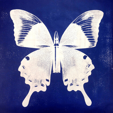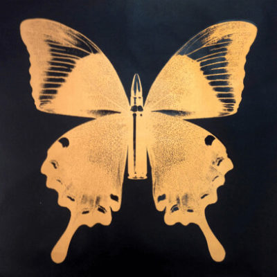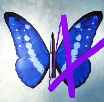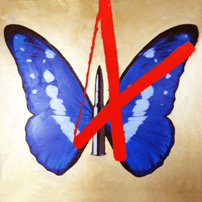 BULLET AND BUTTERFLIES mark the artist’s switch from photography to painting. The series revisits his signature figure of a beautiful butterfly fused with war components like bullets and machine guns that perform a powerful transformational metaphor that alludes to life, war, death, and metamorphosis.